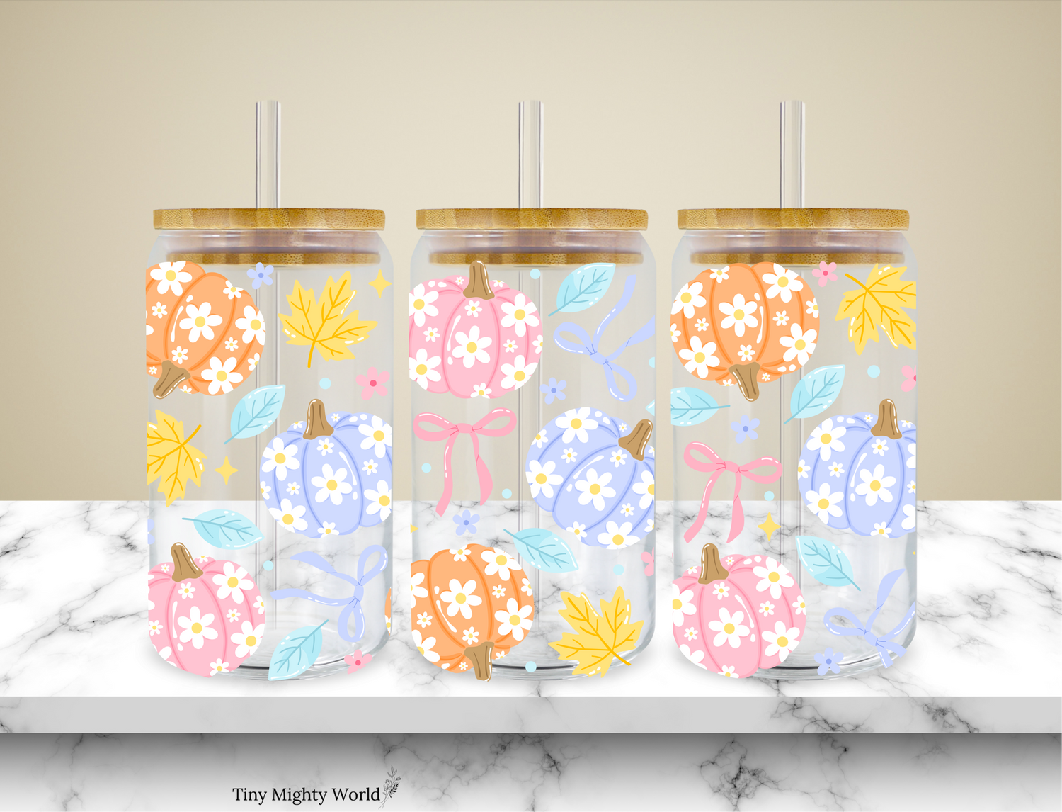 Ghost Pink Pumpkin Halloween Spooky - 16 oz Glass Mug with Handle & Plastic Lid for Straw – Reusable Drinking Cup - UVDTF Stickers