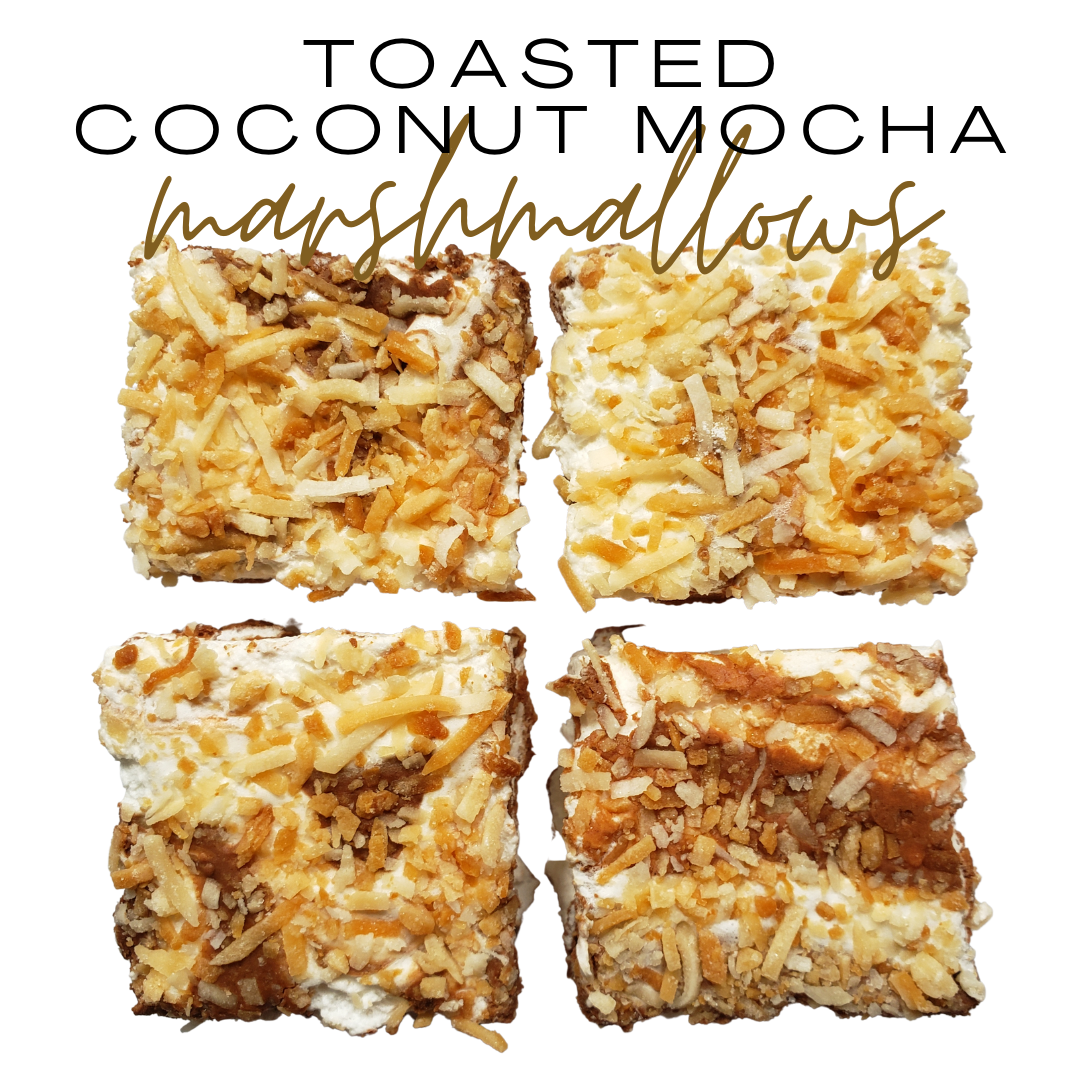 Des guimauves aromatisées à la noix de coco tourbillonnant avec une garniture expresso au chocolat et garnies de noix de coco grillée. Cette mauve est un favori pour grignoter dès la sortie du sac !