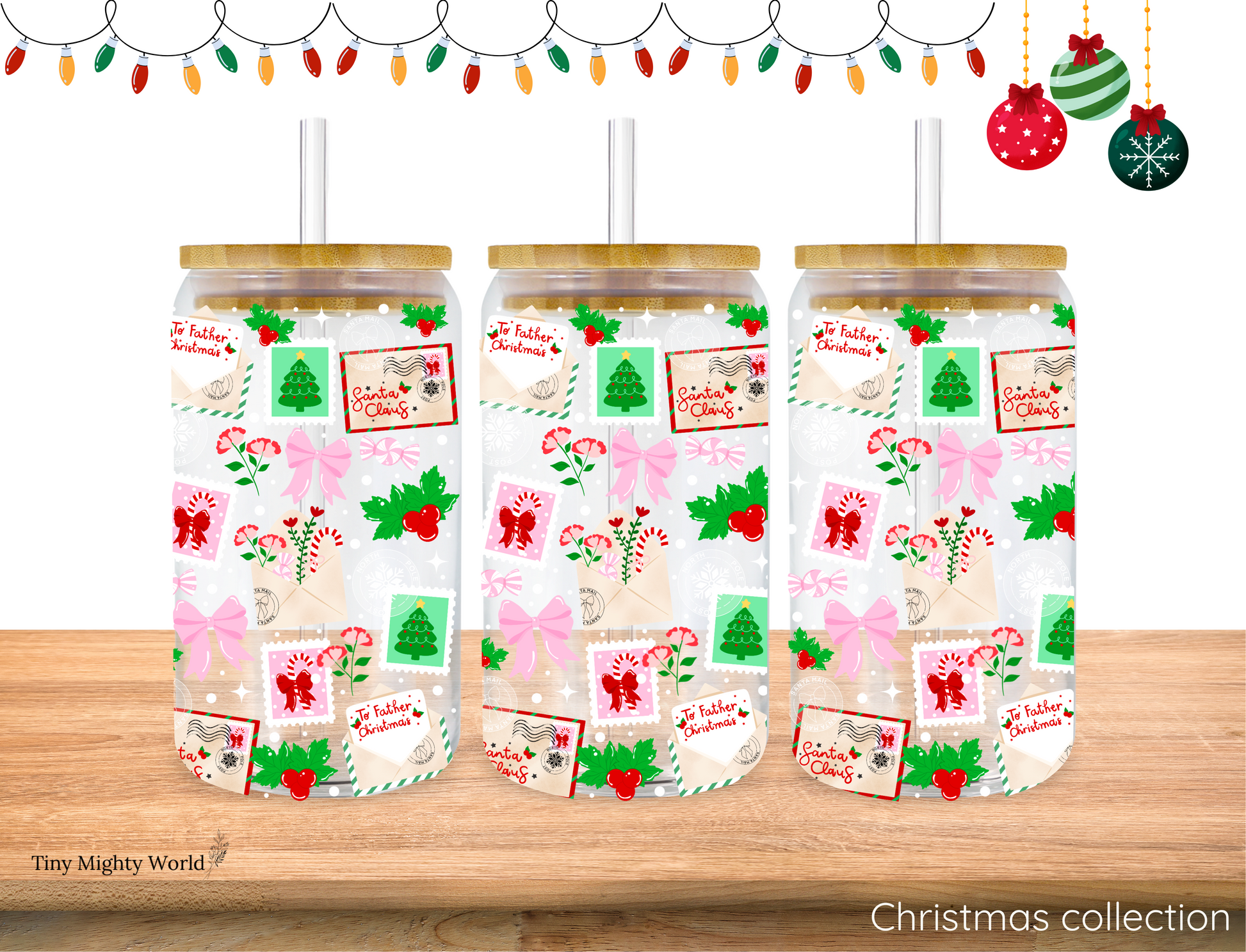 UV DTF Decal or Glass Cup – 16oz Cup or Transfer Sheet Option - Christmas Winter Stamps Santa